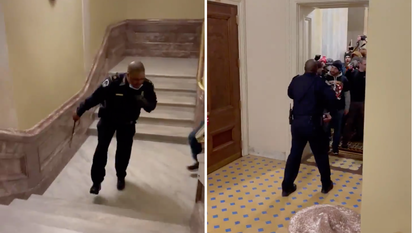 A us capitol police officer is being called a hero for singlehandedly steering a mob away from the senate chambers during the deadly riots.